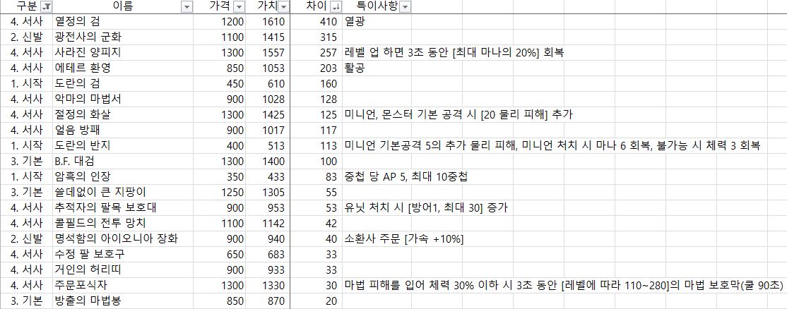 다음으로는 전설, 신화급을 제외한 가성비 좋은 아이템을 살펴 보겠다. (주문 검, 치감 등 아이템의 고유 효과는 포함하지 않았고, 이는 뒤에 따로 언급한다.)