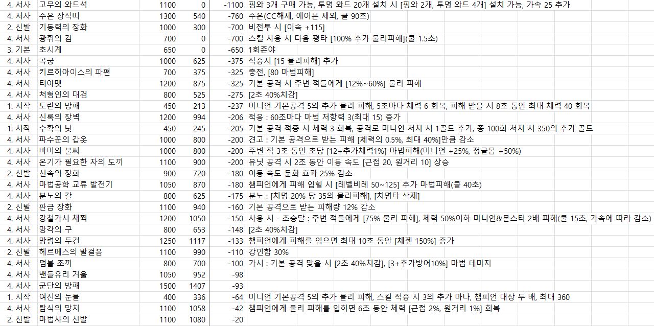 이제 가장 가성비가 안 좋은 아이템(전설, 신화급 제외)을 알아보자. 여기에서는 아이템의 고유 효과까지 다뤄본다.