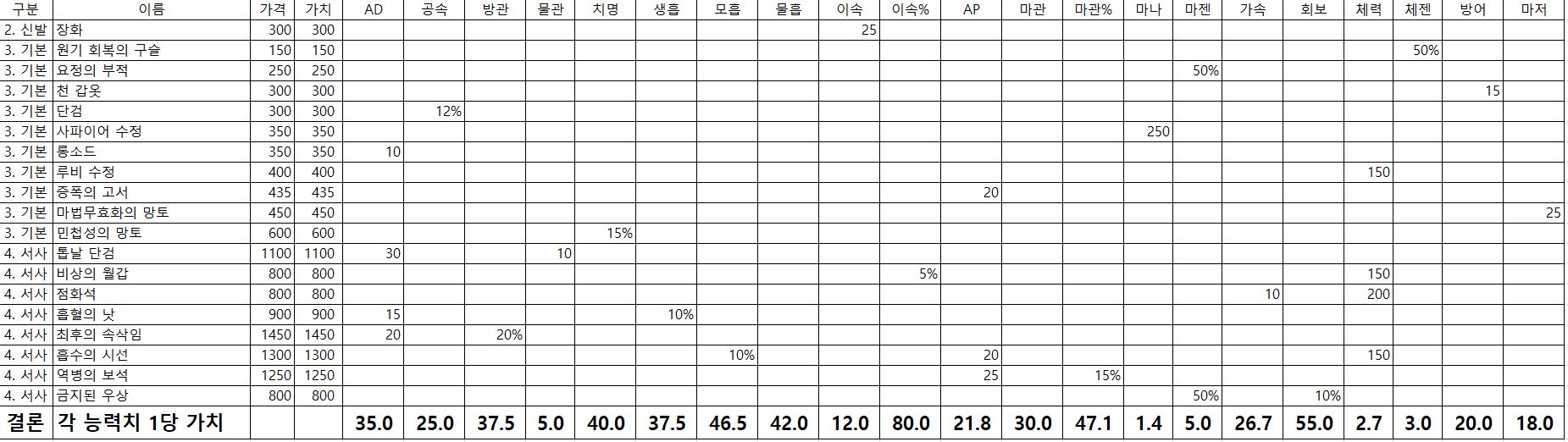 물흡(물리 피해 흡혈, %) : 하위 아이템에 기준이 없기 때문에 생흡과 모흡의 평균값으로 계산했다. 1%당 42골드