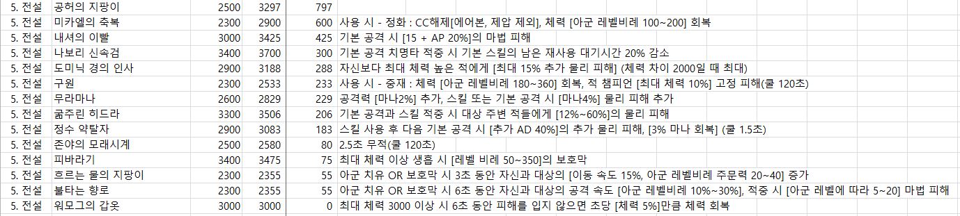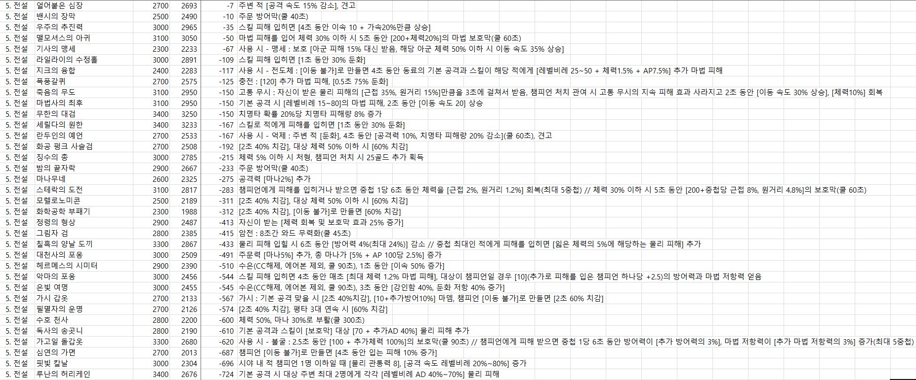전설급 아이템 63개 중 14개만이 0 이상의 가치를 가지고 있었다. 여기부터는 본격적으로 고유 효과가 점철되기 시작한다는 것을 의미하기 때문에 이를 염두에 두어 판단해야 한다.